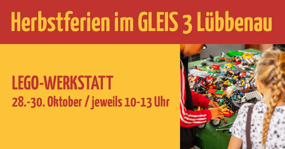 LEGO Fans aufgepasst: In den Herbstferien lädt die LÜBBENAUBRÜCKE Jungen und Mädchen ab 7 Jahre zum gemeinsamen Bauen und technischem Tüfteln ein. Jeweils von 10 bis 13 Uhr wird das Atelier des GLEIS 3 zur Legobaustelle. Wer noch LEGO Steine spenden möchte kann diese bei der LÜBBENAUBRÜCKE abgeben.Die Teilnahme ist für Kinder und Jugendliche von 7 bis 17 Jahren kostenfrei. Eine Anmeldung ist erforderlich und online möglich.